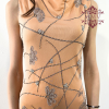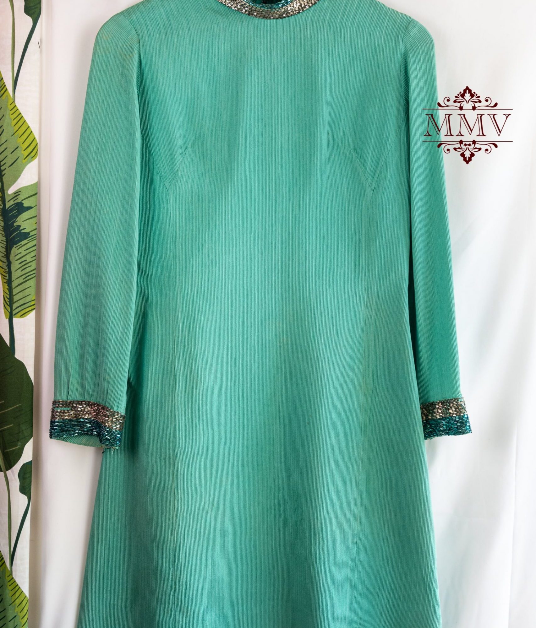 Impreziosito da ricami intricati e dettagli in perline e strass argentati, che seguono un motivo floreale lungo il tessuto.