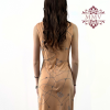 Il taglio dell’abito è leggermente svasato sul fondo, per il resto invece risulta aderente al corpo, non presenta maniche ed il collo è rotondo e semplice.