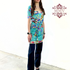 Lo scollo quadrato valorizza il décolleté in modo elegante, le maniche sono corte con un bordo chiaro che richiama quello dell’orlo dell’abito stesso.