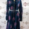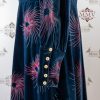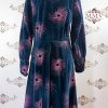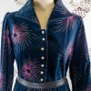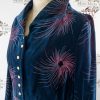 Abito sartoriale anni ’70 in velluto color blu scuro, decorato da fuochi artificiali stilizzati sui toni del rosa ricamati a macchina.