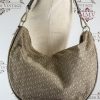 Borsa Pollini a mezza luna anni 2000 in tela beige, con motivo monogram Pollini ripetuto su tutta la superficie.