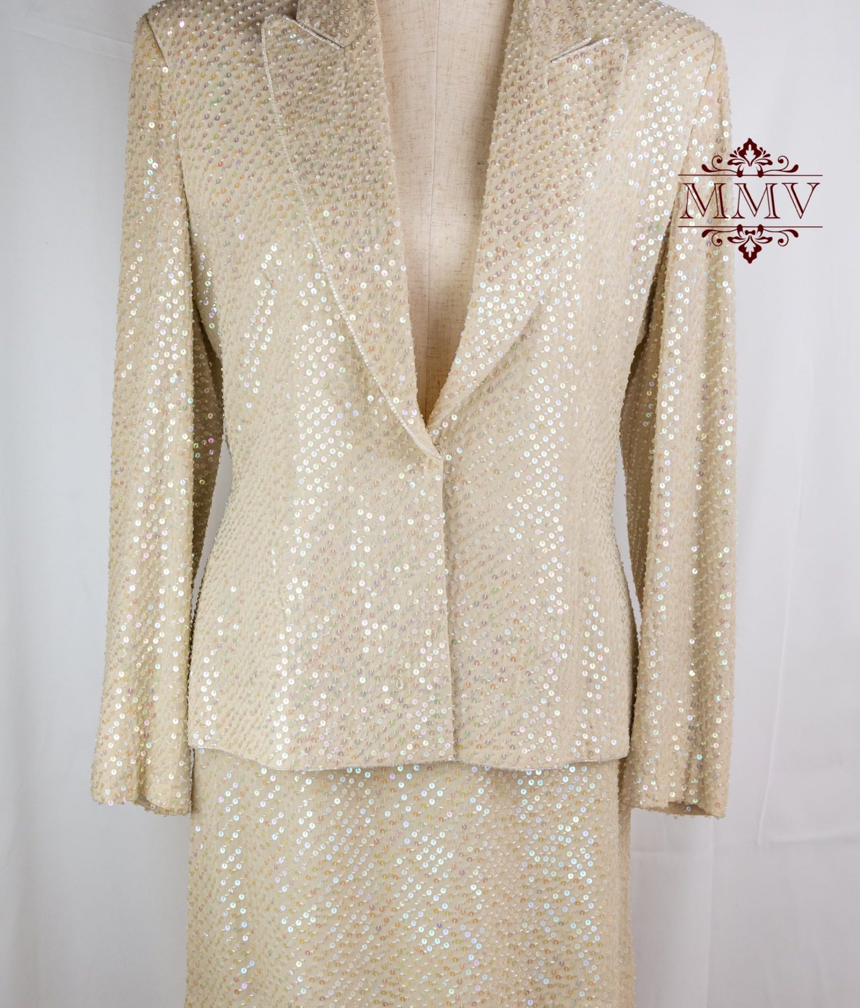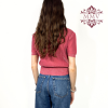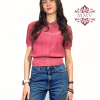 La maglia ha un taglio corto con fascia aderente che crea una sborsatura, le maniche sono corte con un leggero effetto a palloncino e il colletto è decorato da strass e perline sui toni dell’argento.