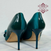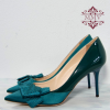 Realizzate in raso misto a pelle verniciata color petrolio, in due tonalità diverse che creano un effetto bicolore.